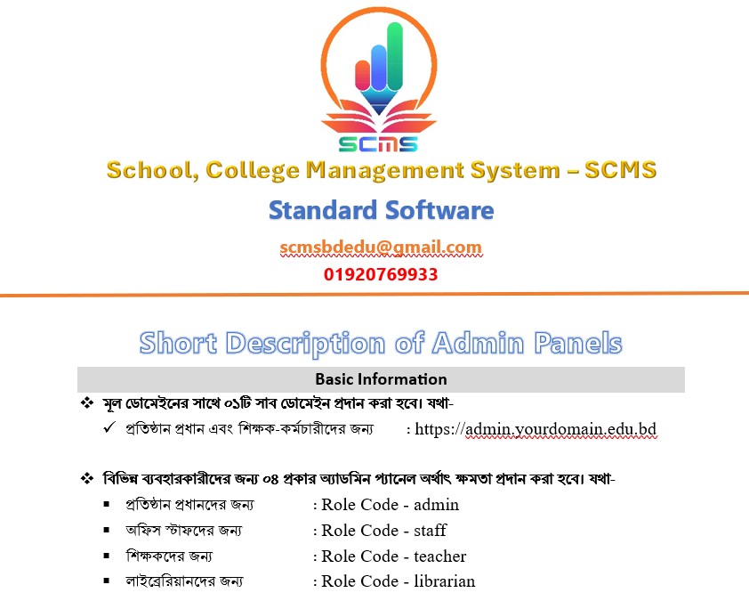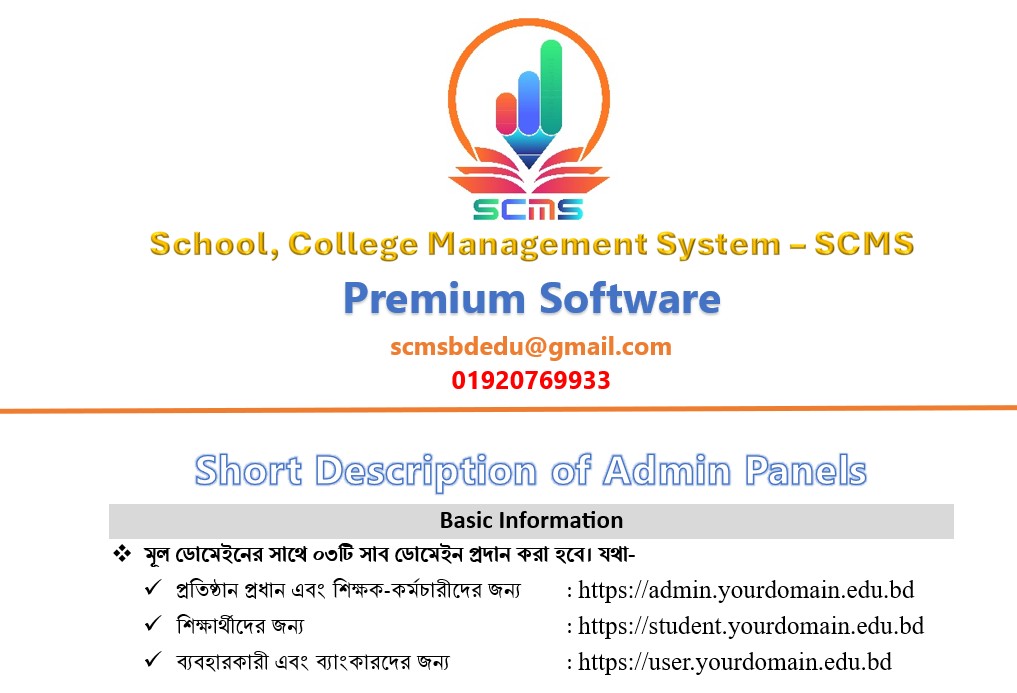 ডিজিটাল স্কুল কলেজ ম্যানেজমেন্ট সিস্টেম- এসসিএমএস দেশের সর্বাধুনিক পূর্ণাঙ্গ স্মার্ট স্কুল কলেজ ম্যানেজমেন্ট সিস্টেম। সফটওয়্যারের কাজ সুষ্ঠুভাবে করার জন্য মূল ডোমেইনের সাথে অ্যাডমিন, শিক্ষার্থী এবং ব্যবহারকারীদের জন্য তিনটি সাব-ডোমেইন যুক্ত করা হয়েছে। অ্যাডমিন সাব-ডোমেইনে প্রতিষ্ঠান প্রধান, স্টাফ, শিক্ষক, লাইব্রেরিয়ান এবং পরীক্ষা কিমিটির জন্য আলাদা আলাদা ক্ষমতা দেওয়া হয়েছে। শিক্ষার্থী সাব-ডোমেইনে শুধুমাত্র শিক্ষার্থীদের জন্য আলাদা প্যানেল এবং সাধারণ ব্যবহারকারীদের জন্য সাব-ডোমেইনে অভিভাবক, জিবি সদস্য, ব্যাংকারদের জন্য প্যানেল যুক্ত করা হয়েছে। এসসিএমএস একটি প্রতিষ্ঠানকে অর্থনৈতিক এবং সামাজিকভাবে সম্মানজনক স্থানে নিয়ে যেতে সক্ষম। আশাকরি এসসিএমএস বাংলাদেশকে স্মার্ট বাংলাদেশে পরিণত করতে অগ্রণী ভূমিকা পালন করবে। এসসিএমএস ওয়েবসাইটটিতে বিদ্যার্থীদের জন্য সকল প্রকার জ্ঞান অর্জনের প্লাটফর্ম তৈরি করা হয়েছে যেন তারা নিজেদেরকে দক্ষ, যোগ্য ও স্মার্ট করে গড়ে তুলতে পারে।