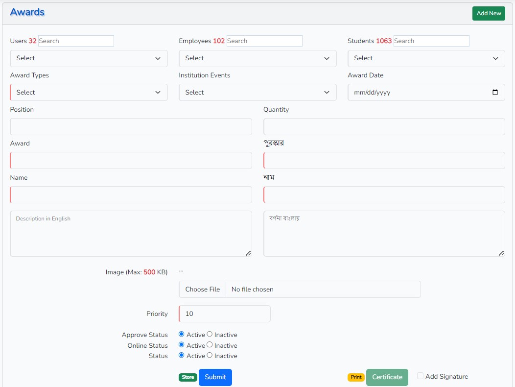 শিক্ষক-কর্মচারী, অভিভাবক, বিষিষ্ঠ ব্যক্তি, শিক্ষার্থীকে পুরস্কার প্রদান করা যাবে এবং সার্টিফিকেট প্রিন্ট করা যাবে।