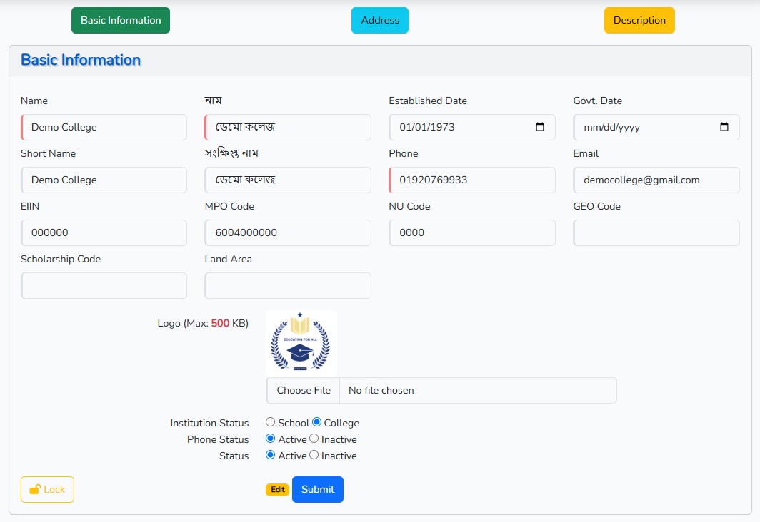 প্রতিষ্ঠানের তথ্য সংশোধন করা যাবে।